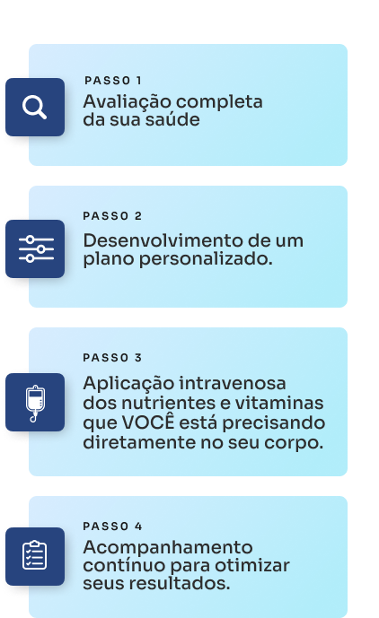 Nossa abordagem personalizada começa com uma avaliação detalhada da sua saúde e necessidades. A partir disso, criamos um plano de soroterapia feito sob medida para você.